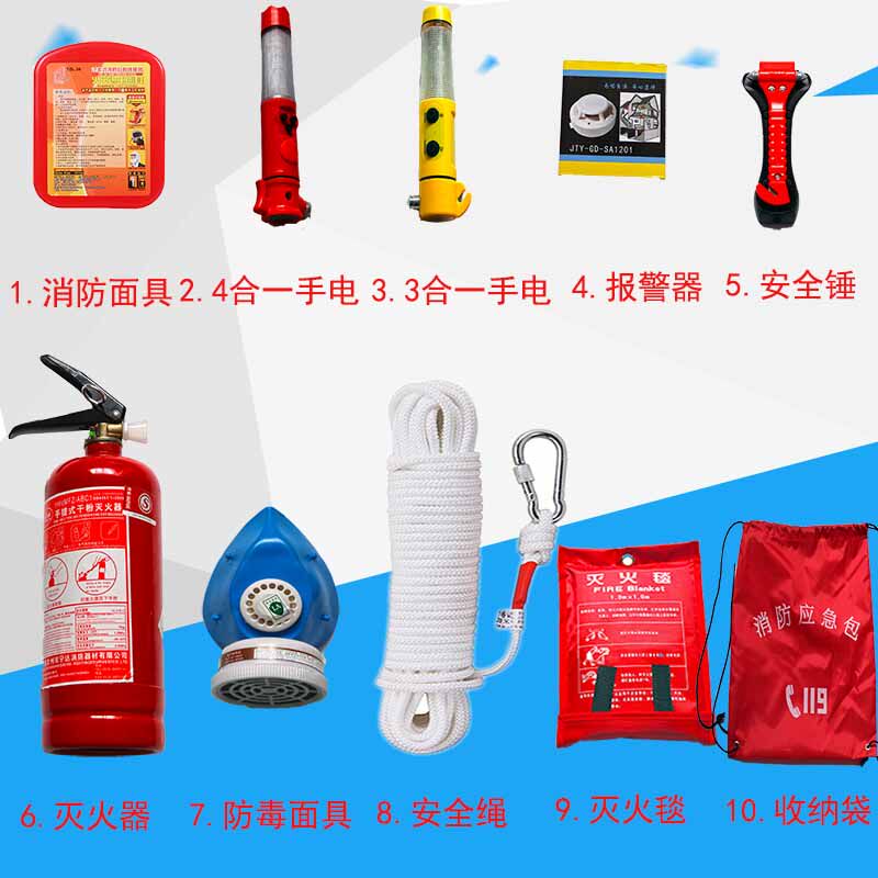 Fire emergency set · four-piece set of fire emergency set · five-piece set of fire emergency set • six-piece set of fire emergency set · seven-piece set of fire emergency set · high main picture • supreme fire emergency kit (empty package) fire mask gas mask fire wire rope (20 meters) smoke alarm safety hammer 3 in one flashlight 4 in 1 flashlight fire extinguishing blanket 1 kg dry powder fire extinguisher 980ml water-based fire extinguisher simple four-piece set simple five-piece set of slow drop set (standard 20 meters, Customizable) 2 kg dry powder fire extinguisher 3 kg dry powder fire extinguisher 4 kg dry powder fire extinguisher set is 1 kg fire extinguisher, other make up the difference