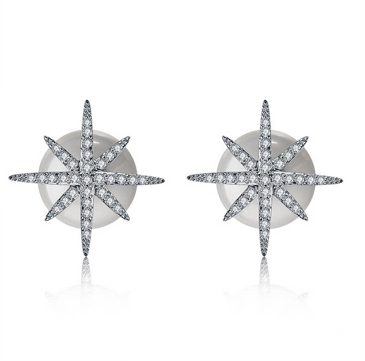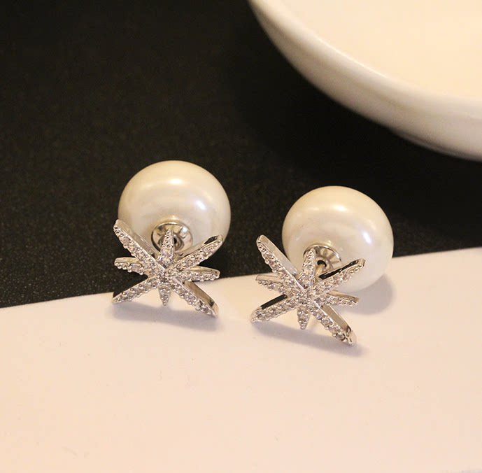Korean version of snowflake double-sided pearl stud earrings 925 sterling silver temperament hypoallergenic diamond-studded star dual-purpose ear jewelry