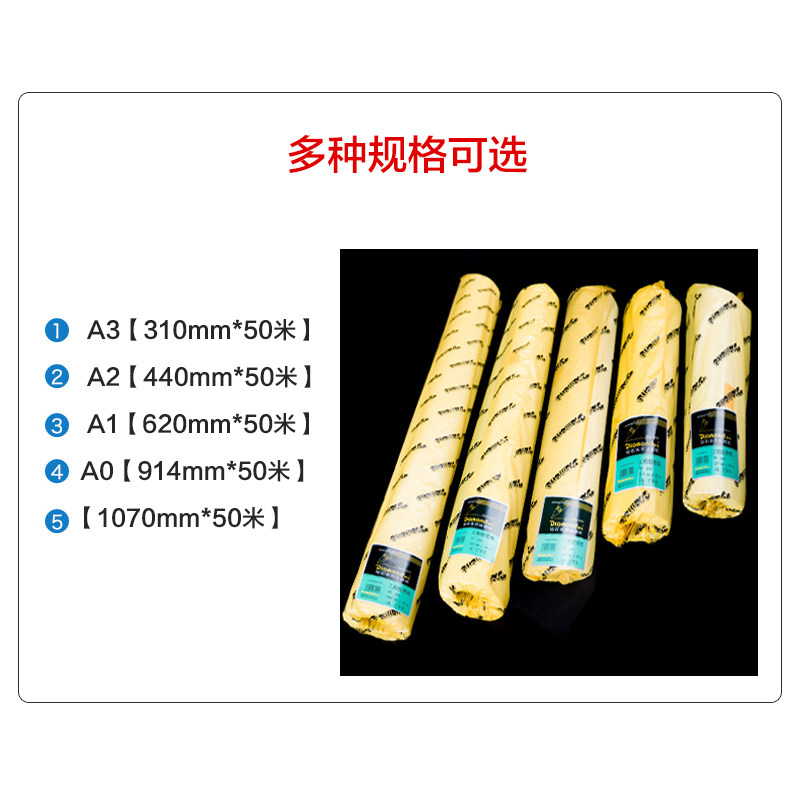 A3 (310mm*50m) 2 inch core A2 (440mm*50m) 2 inch core A1 (620mm*50m) 2 inch core A0 (914mm*50m) 2 inch core (1070mm*50m) 2 inch core