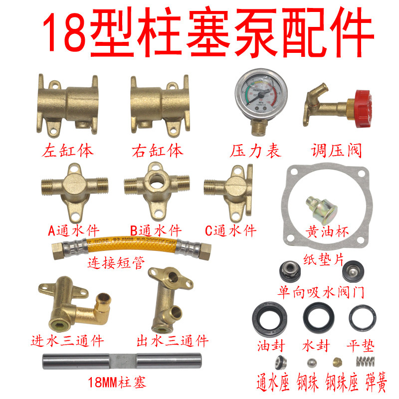 1100W motor pump head (without pressure gauge) 1100W motor pump head (with pressure gauge) 18-type complete set of wearing parts Left cylinder block Right cylinder body Water outlet tee piece Water inlet tee piece Water connection piece Connected to pressure regulation
