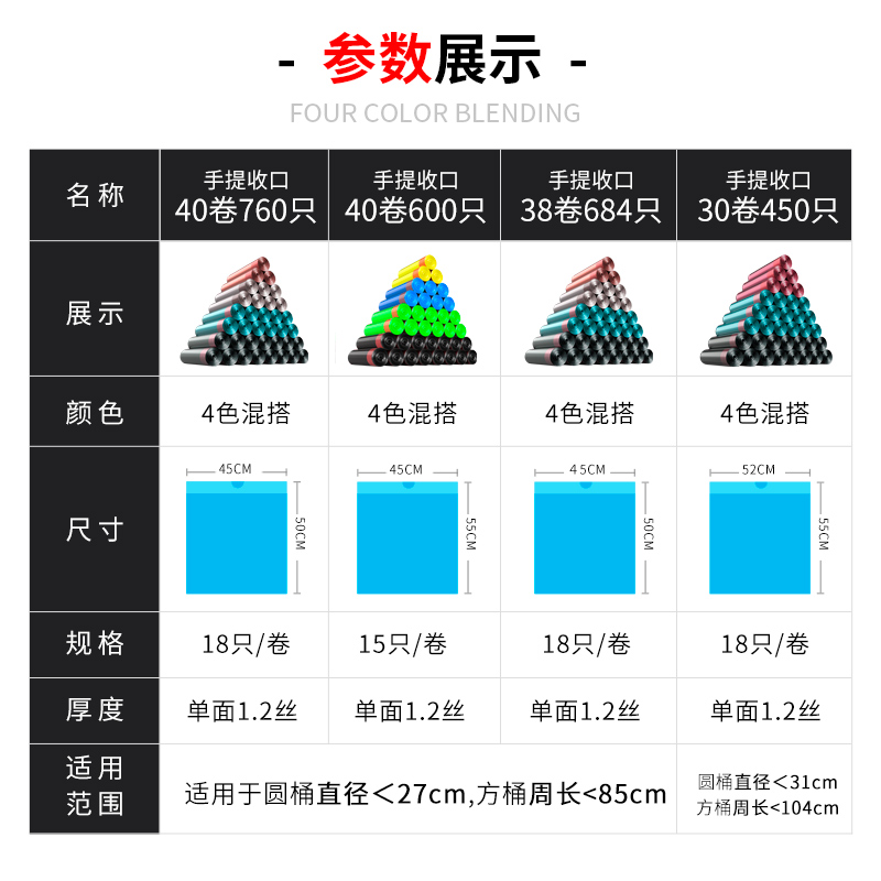 38 rolls 684 45 *50cm medium forest steel bags 30 rolls 450 52 *55cm large forest steel bags 40 rolls 760 45 *50 cm medium mixed color 40 rolls 600 pieces 45 * 55 cm medium mixed color 50 rolls 750 rolls 45 * 45 cm mixed color
