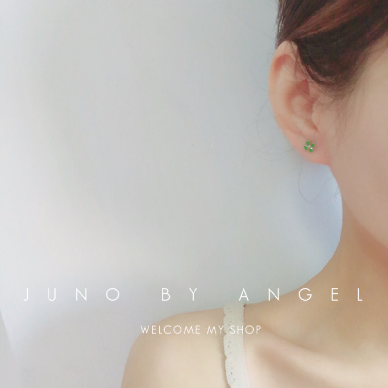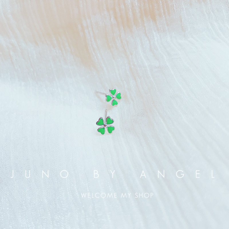 South Korea S925 pure silver four - leaf lucky grass needle girl fresh green drop - oil earrings with fine - rings