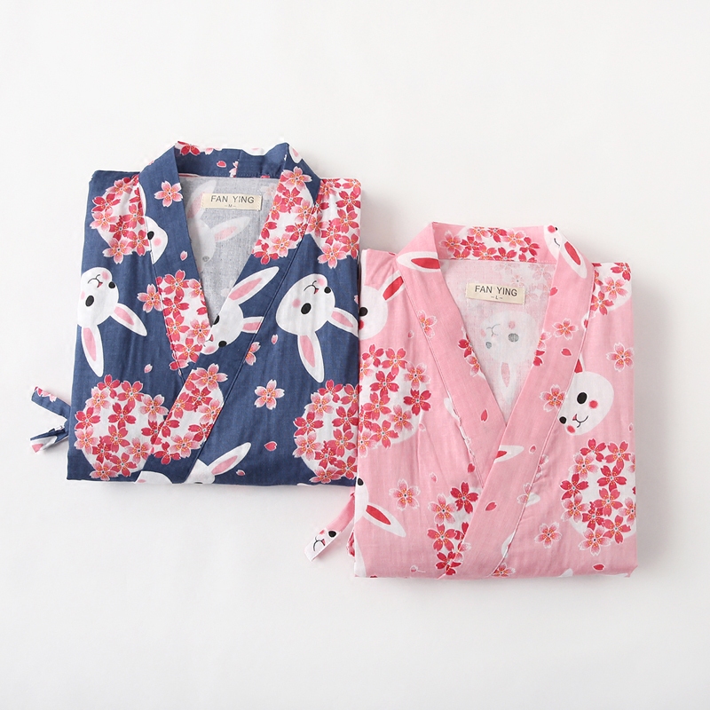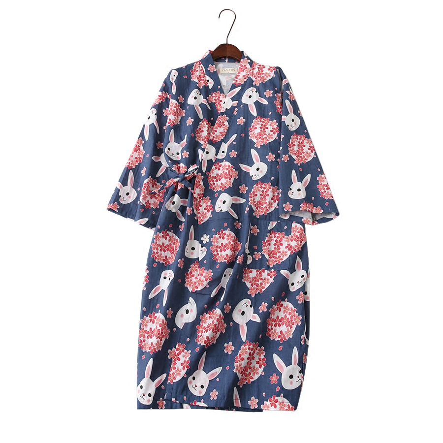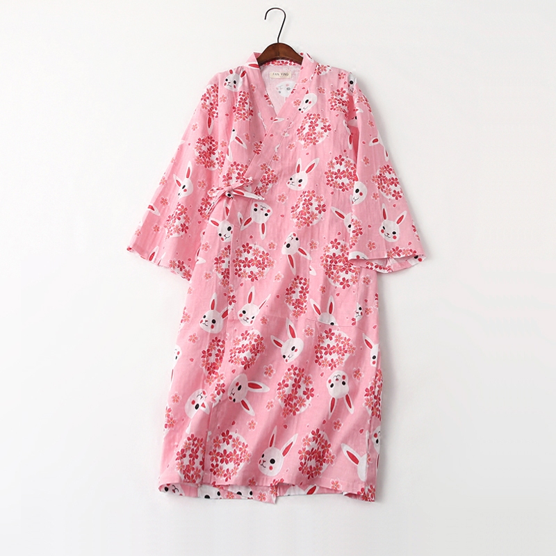Japanese-style nightdress women's spring and summer long-sleeved thin section cute cherry blossom rabbit nightgown Japanese-style kimono pajamas sweat steaming yukata
