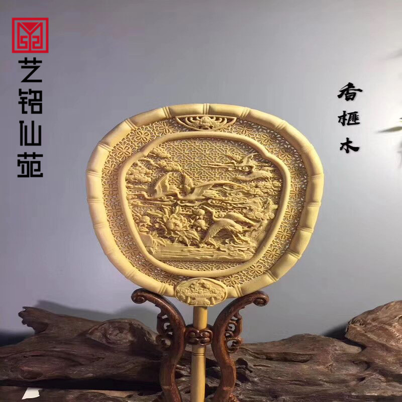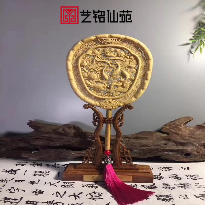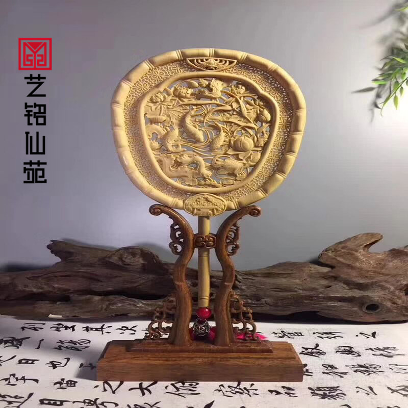 Torreya wooden palace fan ornaments Songhe long-lasting double-sided carving fan Ancient court round fan Nanzhu base personality new style
