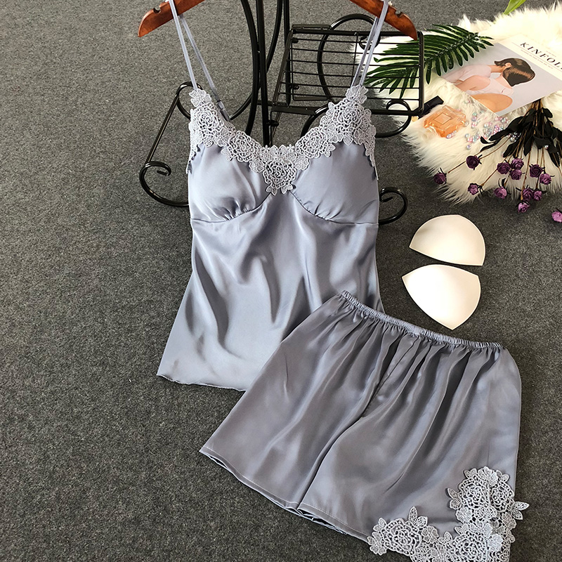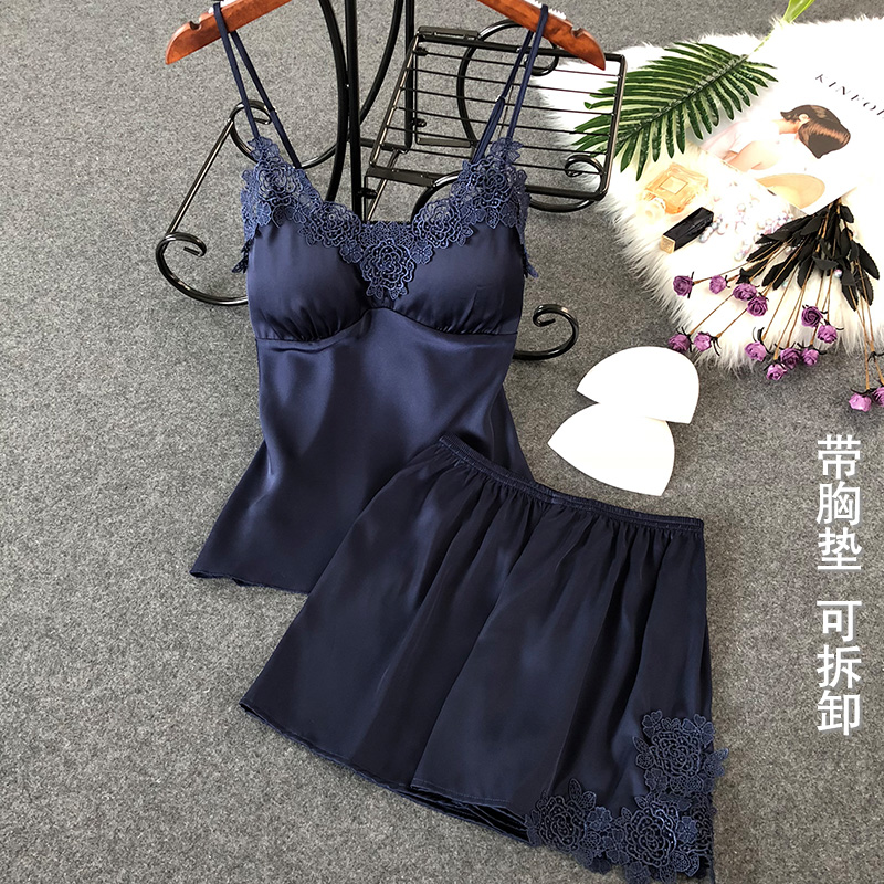 Sexy nightdress woman summer ice silk gathers small bras and hot adult with bra suspension shorts two sets