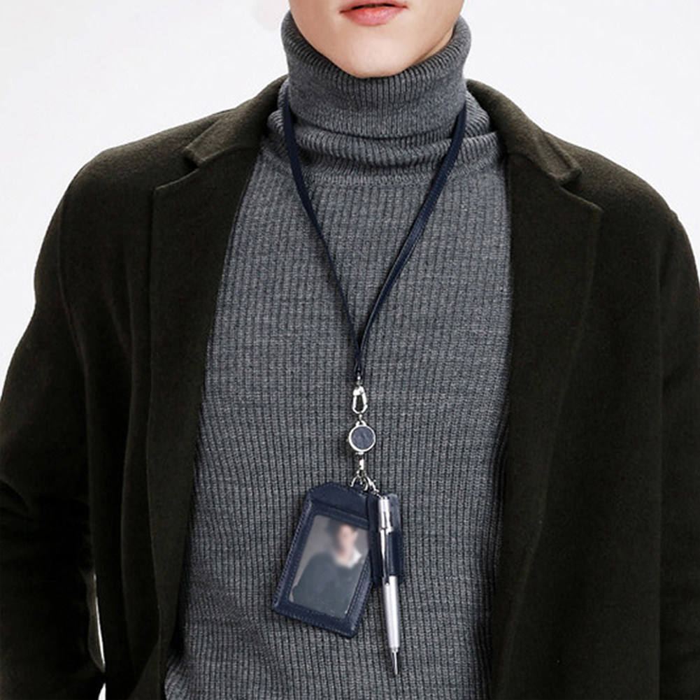 Leather document cover Work card bus Carmen prohibited chuck layer Cowhide card cover telescopic easy pull buckle lanyard can hang pen