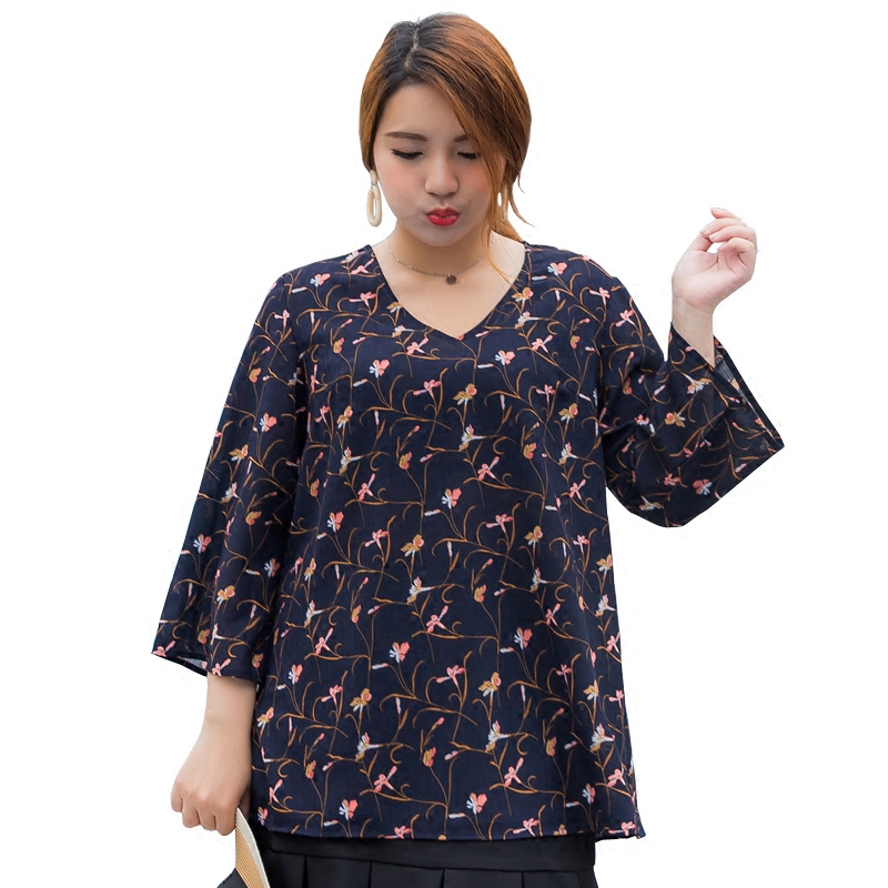 Q large size chiffon shirt female fat mm200 catties loose belly cover V-neck bell sleeve floral top plus fat plus summer