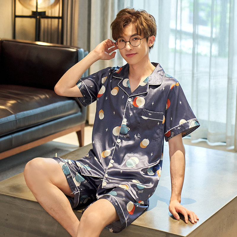 Summer pajamas men silk thin cardigan short sleeve men's home clothes large size ice silk summer shorts set spring and autumn