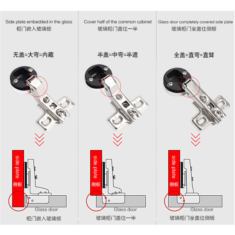 Glass Hinge 2601 Large Bend Glass Hinge 2601 Middle Curved Glass Hinge 2601 Straight Arm