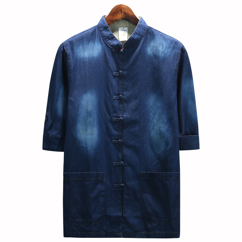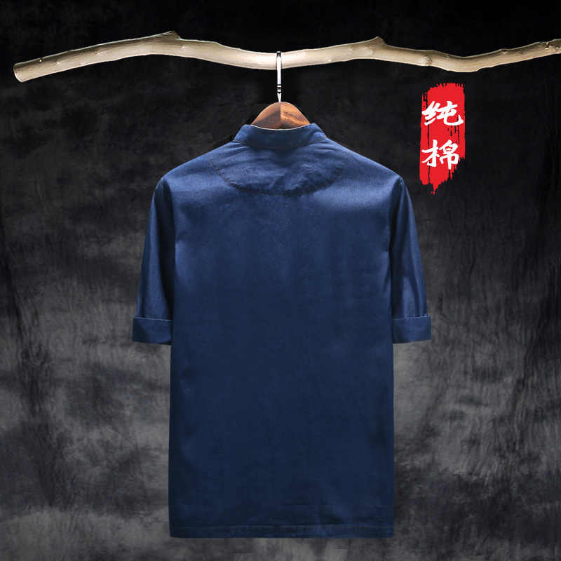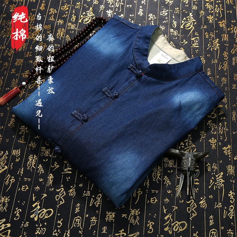 Tang Loaded Men's Pure Cotton Denim Blue China Wind Short Sleeve Summer Blouse Youth Retro Cotton Hemp Loose Version Shirt Summer Dress