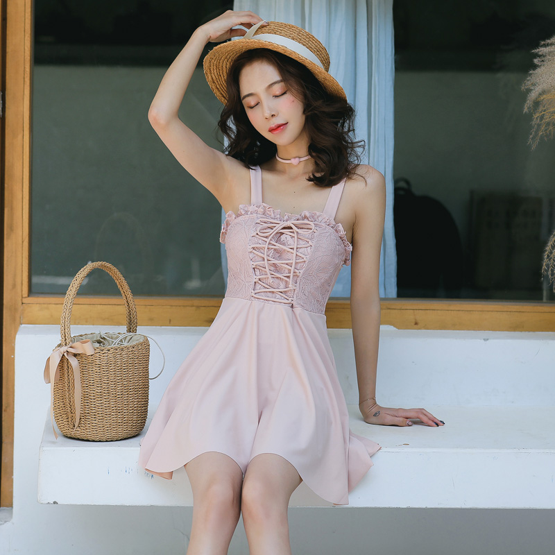 Korean one-piece swimsuit female small fragrant wind skirt type hot spring thin belly big chest gathering sexy holiday swimsuit