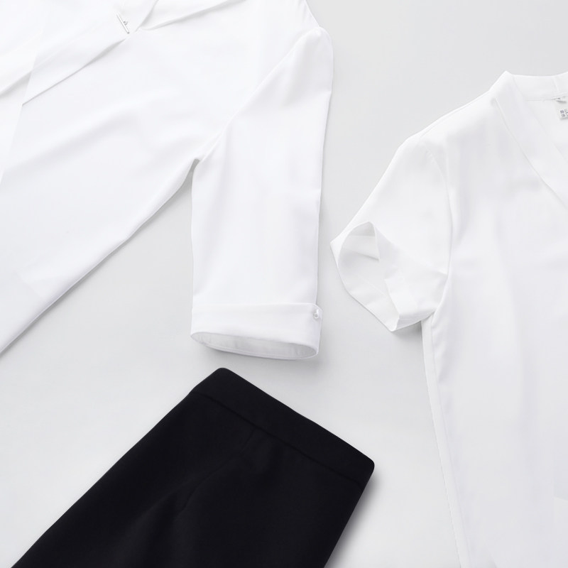 White mid-sleeve shirt White short-sleeved shirt White mid-sleeve shirt Black skirt White short-sleeved shirt Black skirt Black skirt