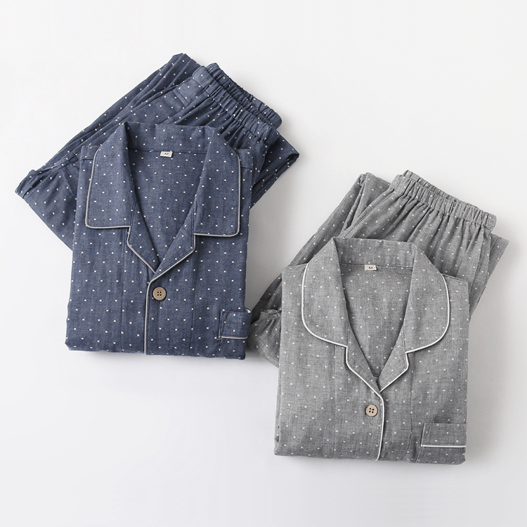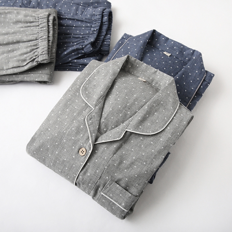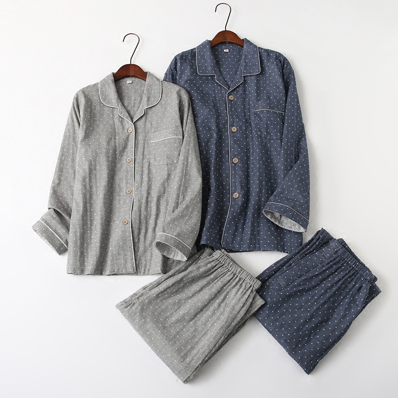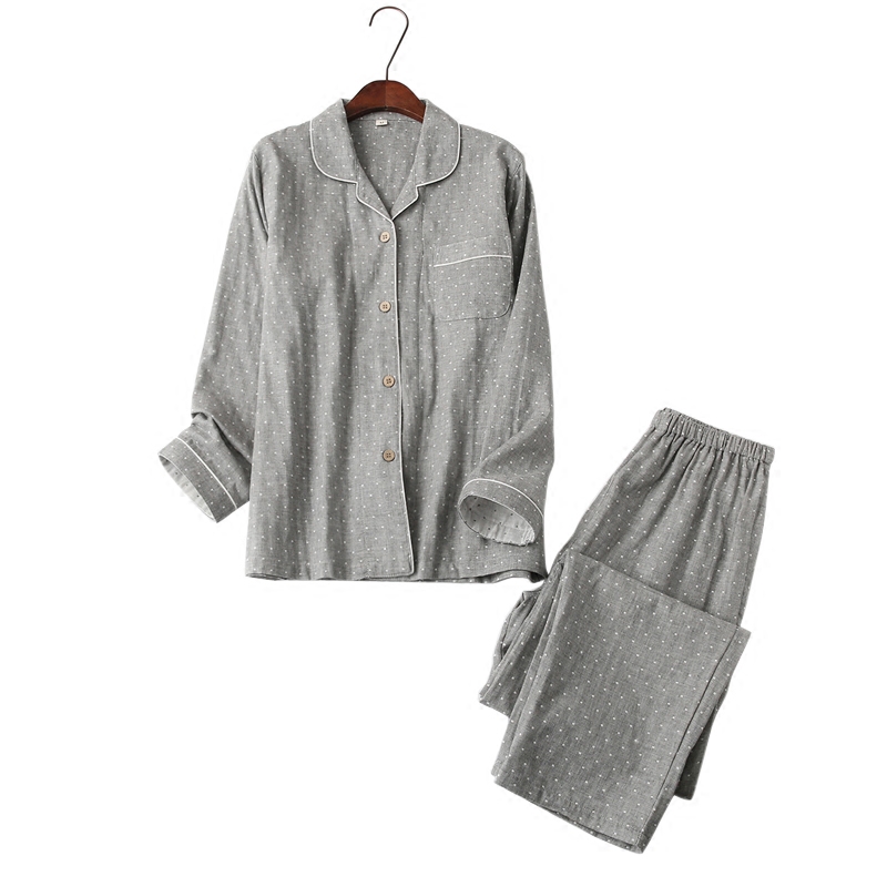 Spring and summer cotton double-layer gauze couple pajamas women's long-sleeved unprinted style men's solid color thin section cotton and linen home service