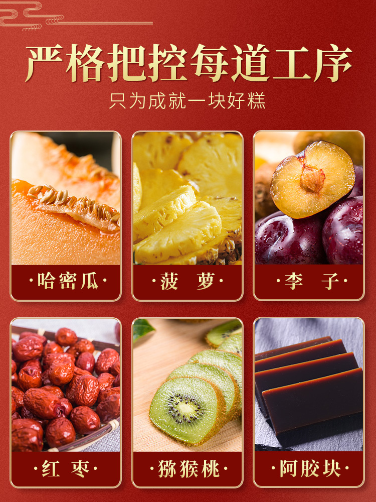 Black Sesame Walnuts Yellow Gelatin Rock Sugar Ejiao Malt syrup Yellow wine Jujube Wolfberry Dried cantaloupe dried Pineapple dried plum Dried raisin Dried Hawthorn