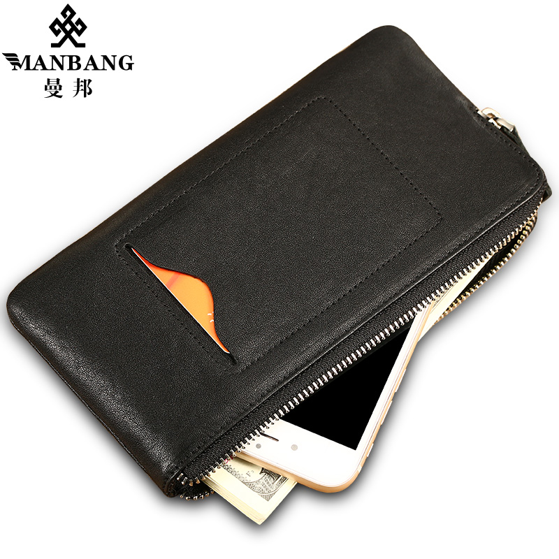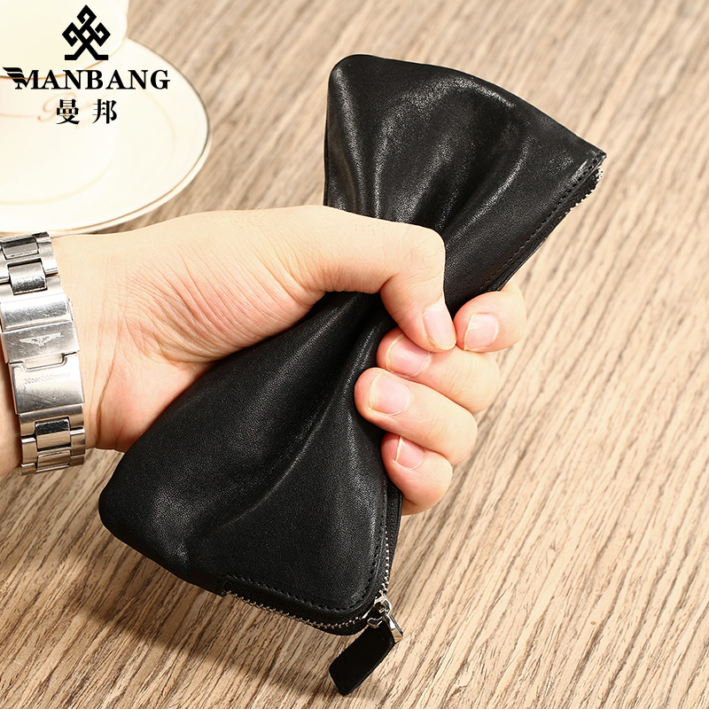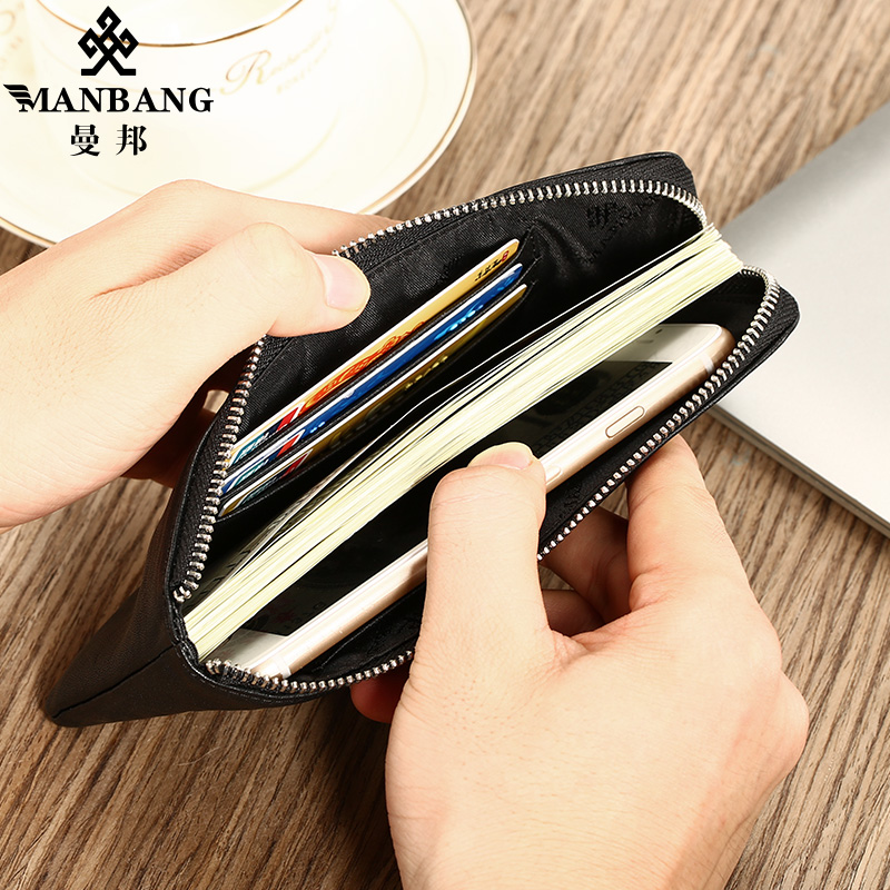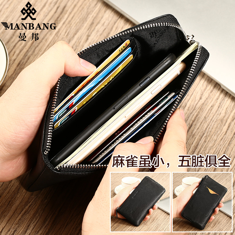 Manbang wallet Male ultra-thin genuine leather Long version Mini mobile phone small hand bag Bull Leather Bracelet Soft Leather Clip Individuality Youth Tide