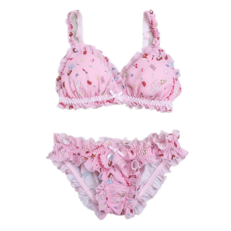 Izuhara D pink cartoon printing sweet and cute chiffon printing girl no steel ring triangle cup set