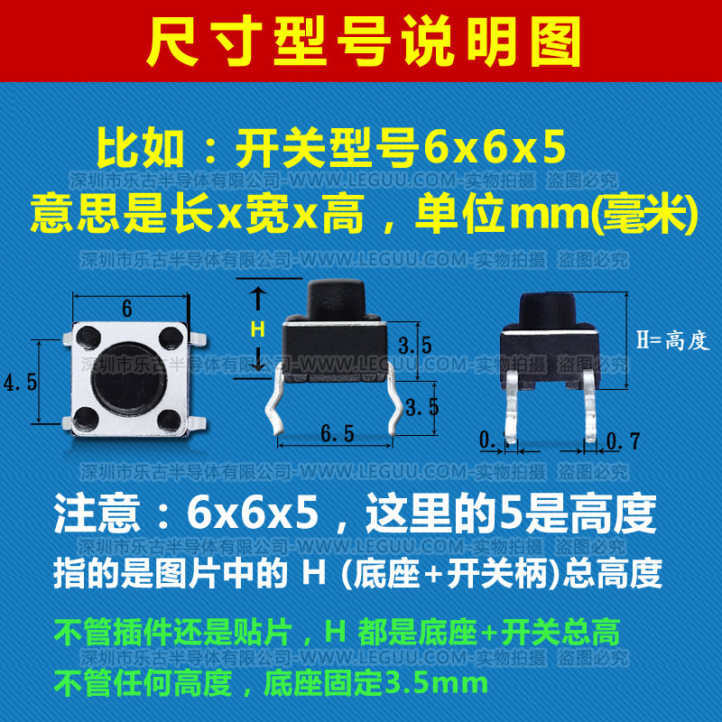 2 feet in the light switch 6*6*4 3 5 7 9 Fretting vertical key switch 6x6x5 middle 2 feet