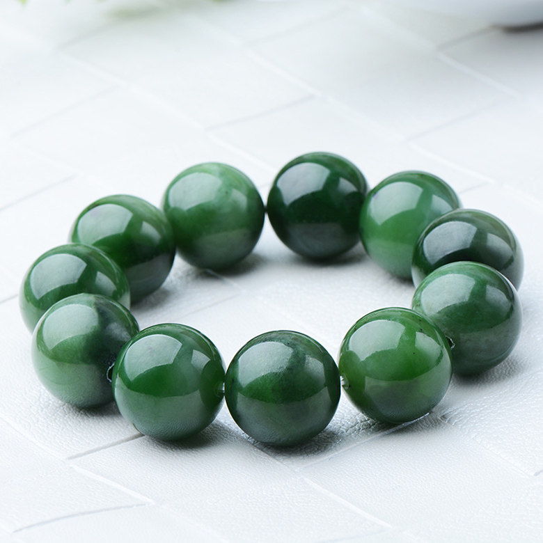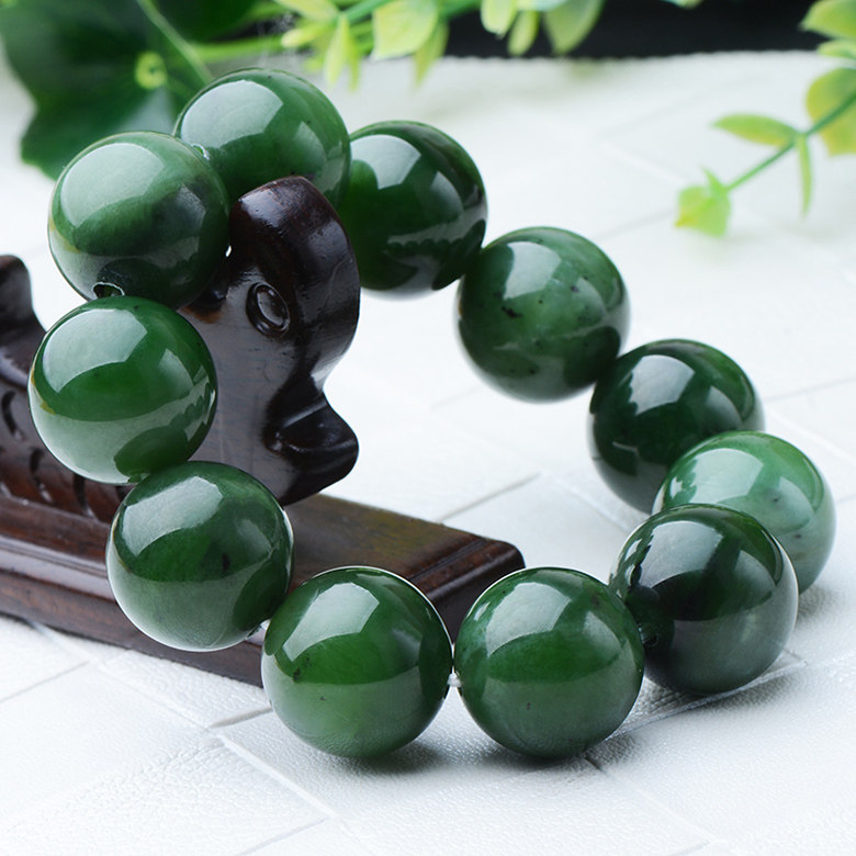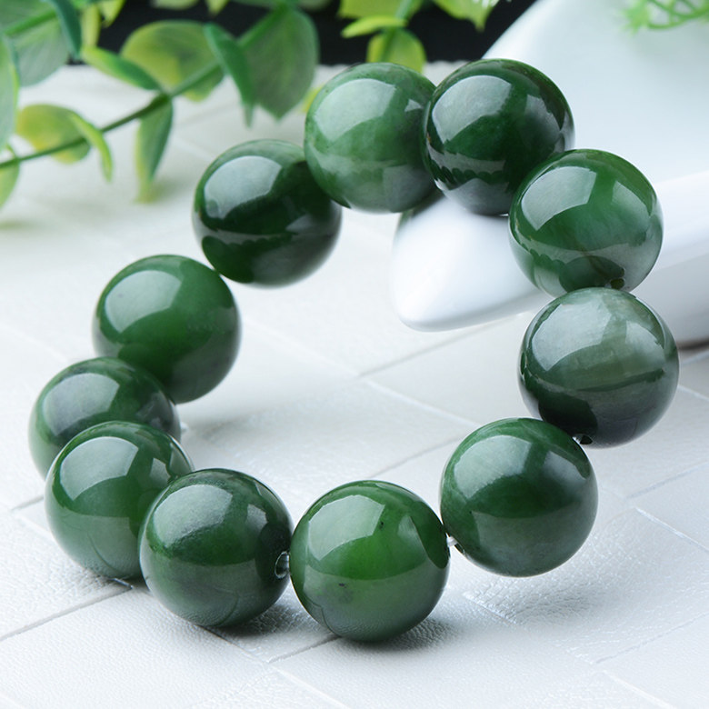 Xinjiang Hetian jasper bracelet 18mm12 pieces, less black spots, spinach green, round, uncracked, and rotten men's bracelets