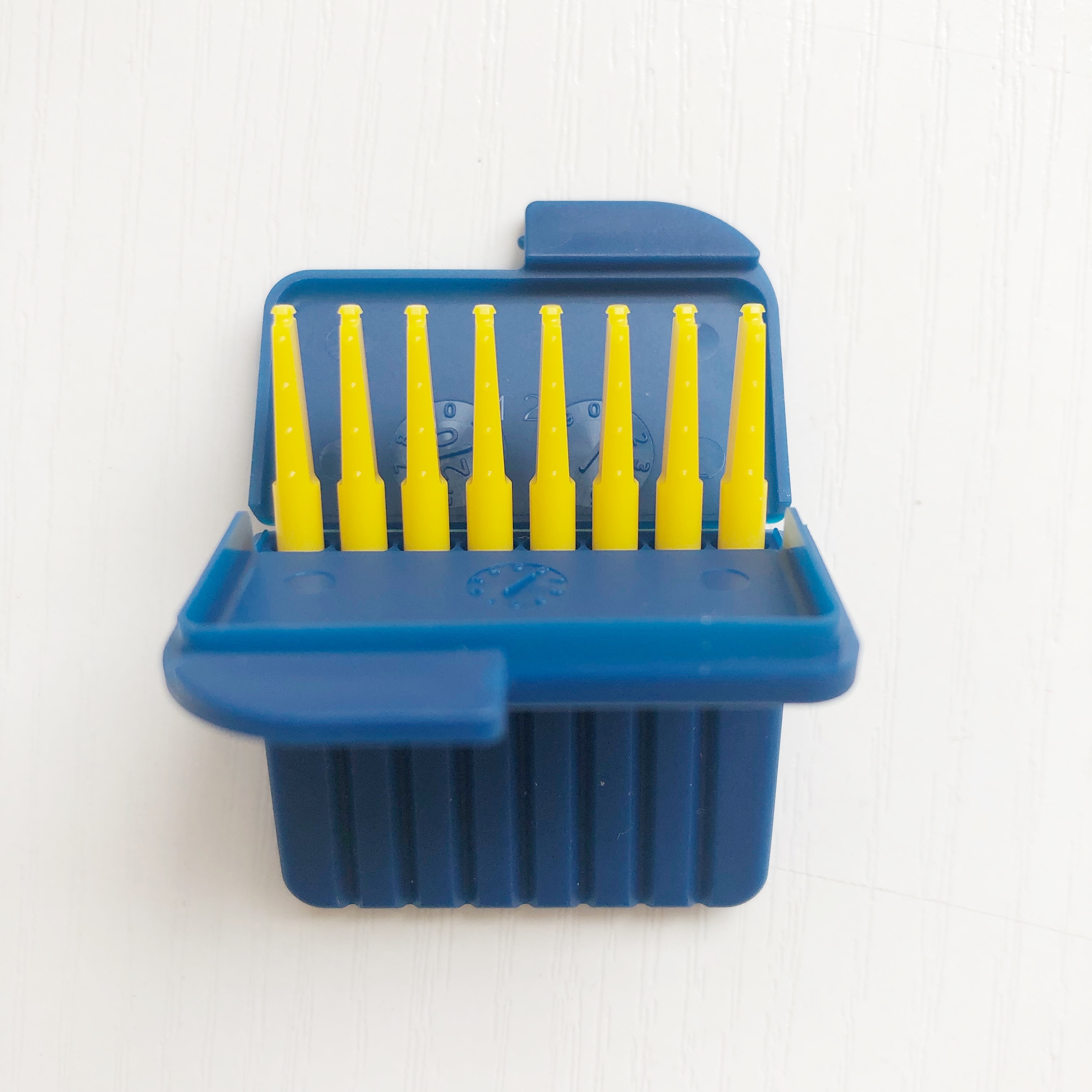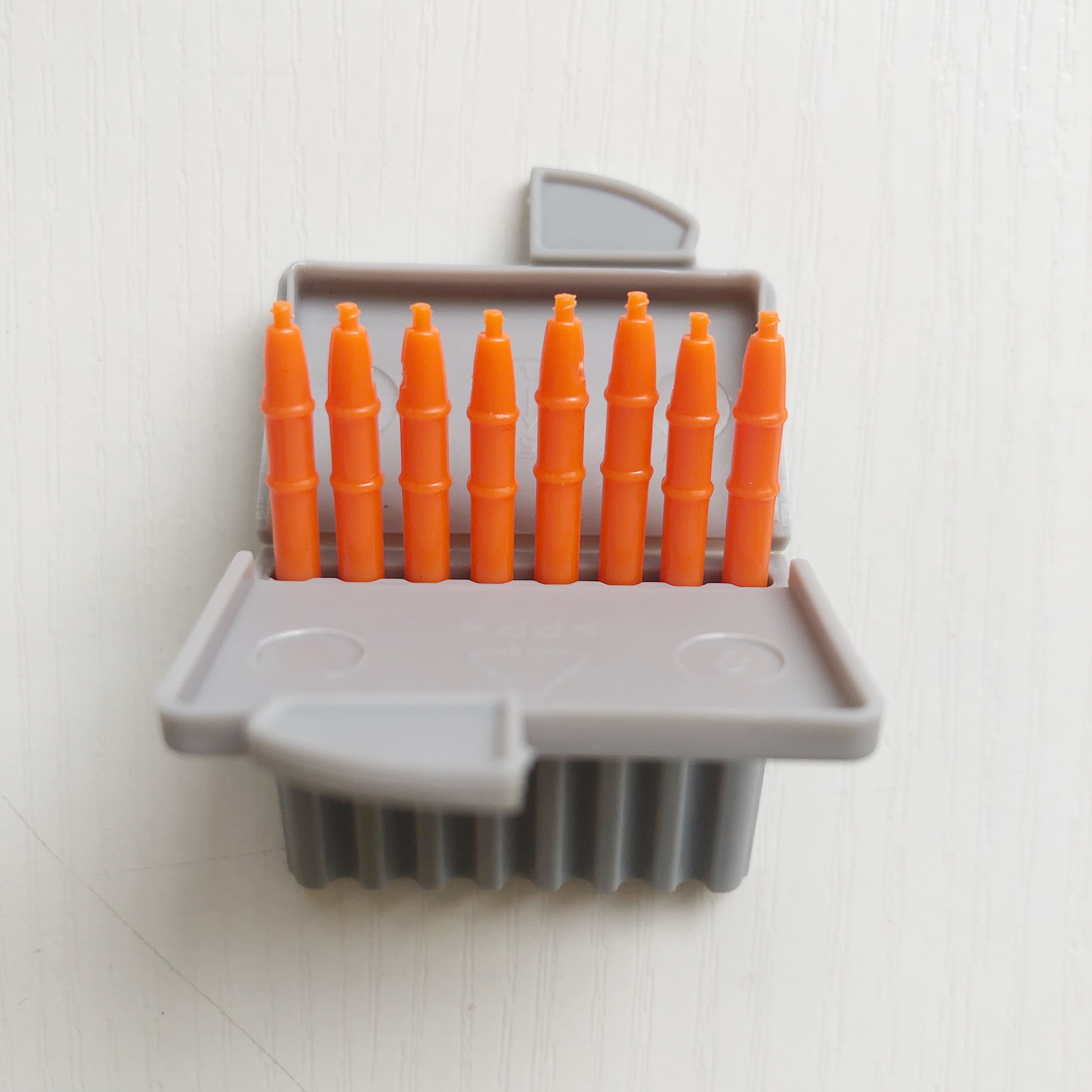 Orange (a plate of 8) blue (a plate of 8) yellow (a plate of 8)