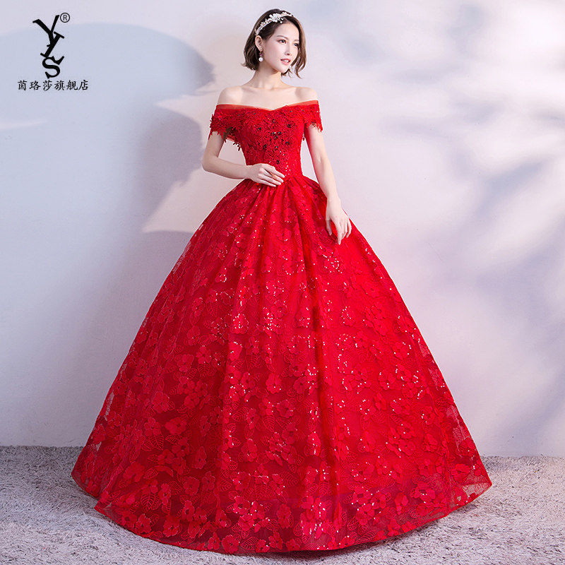 Red wedding toast to the bride 2021 new temperament small pregnant woman with a straight shoulder back door engagement gown.