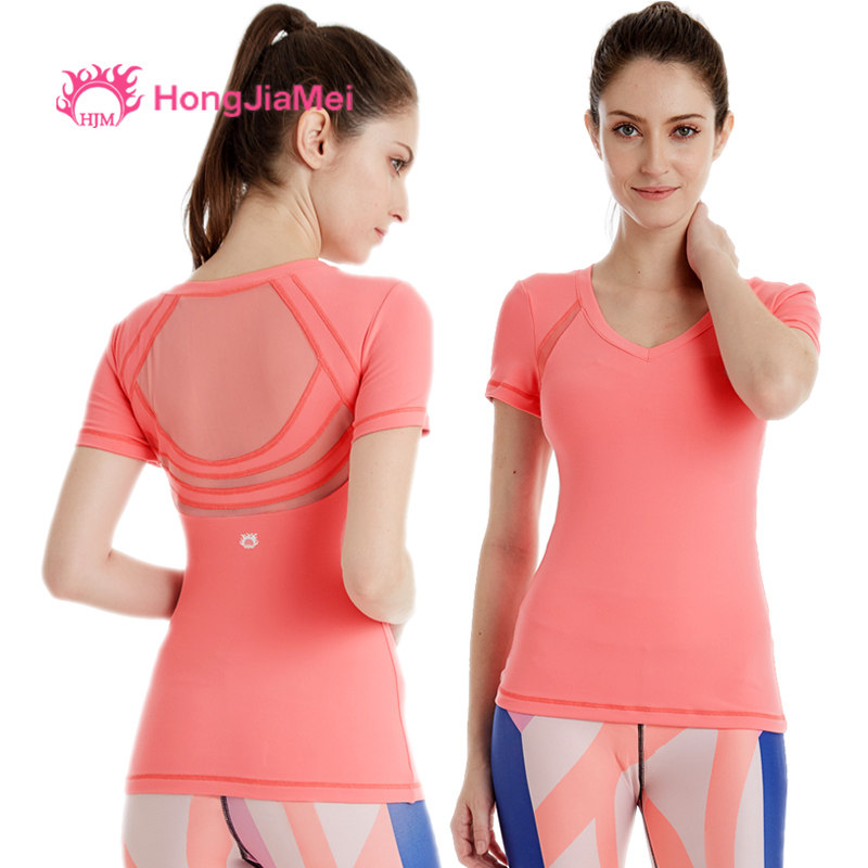 HJM yoga clothing short-sleeved women's V tie chest pad t-shirt professional yoga sportswear top autumn and winter mesh yarn quick-drying