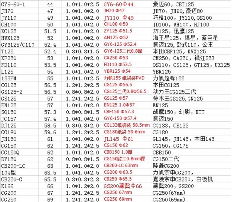 JH70 (47) GY6-60 (44) GY6-125 (52 4) GY6-150 (57 40) CG125 (56 5) CG15
