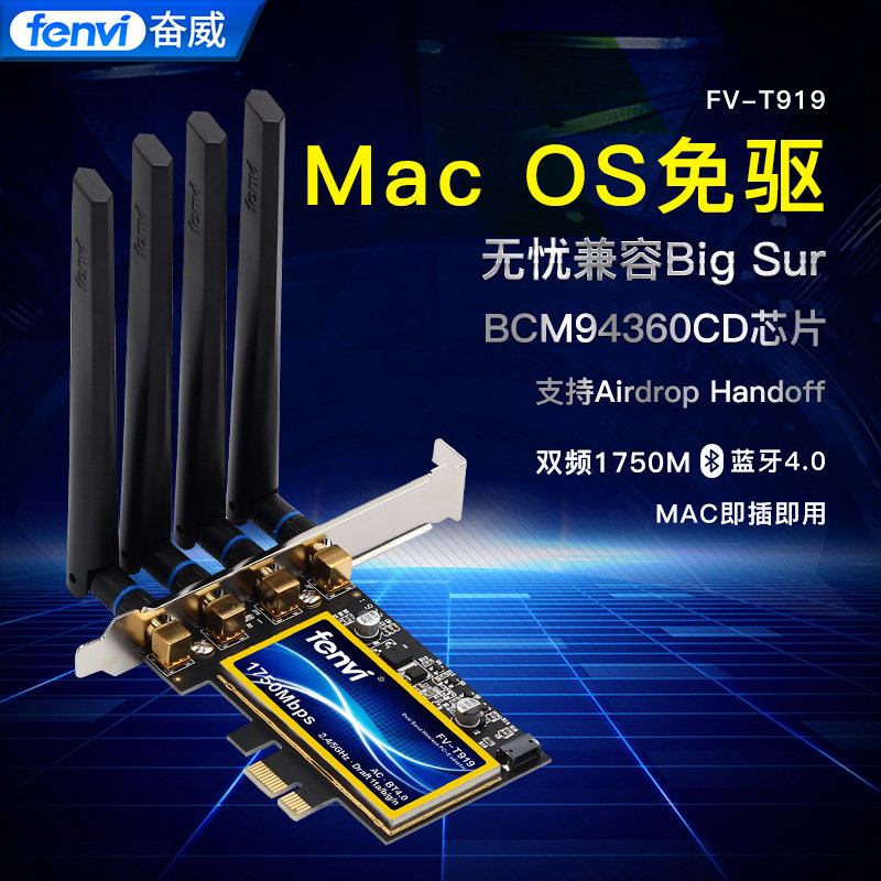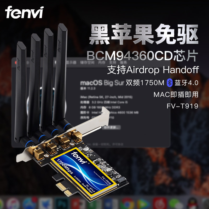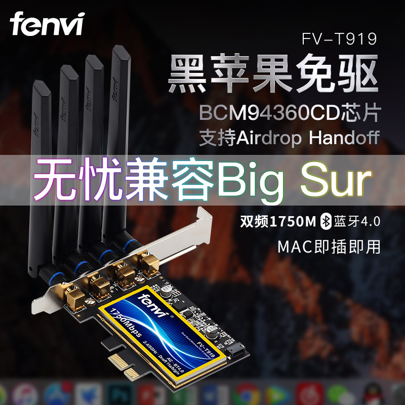Fenvi T919 Black Apple Wireless Network Card MAC No Worries Free-Drive-Free Relay Boton CD Chip Compatible with BigSur built-in pcie desktop computer Bluetooth two-in-one WiF