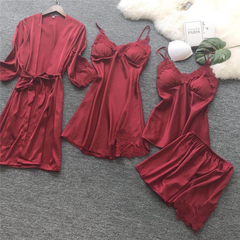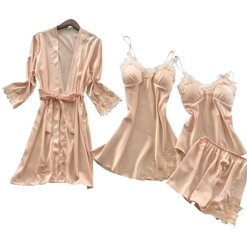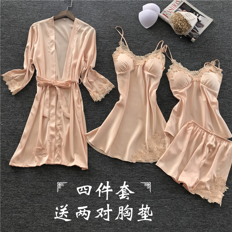 Spring and summer pajamas women's four-piece sexy ice silk suspenders nightdress nightgown with chest pad silk home clothes can be worn outside