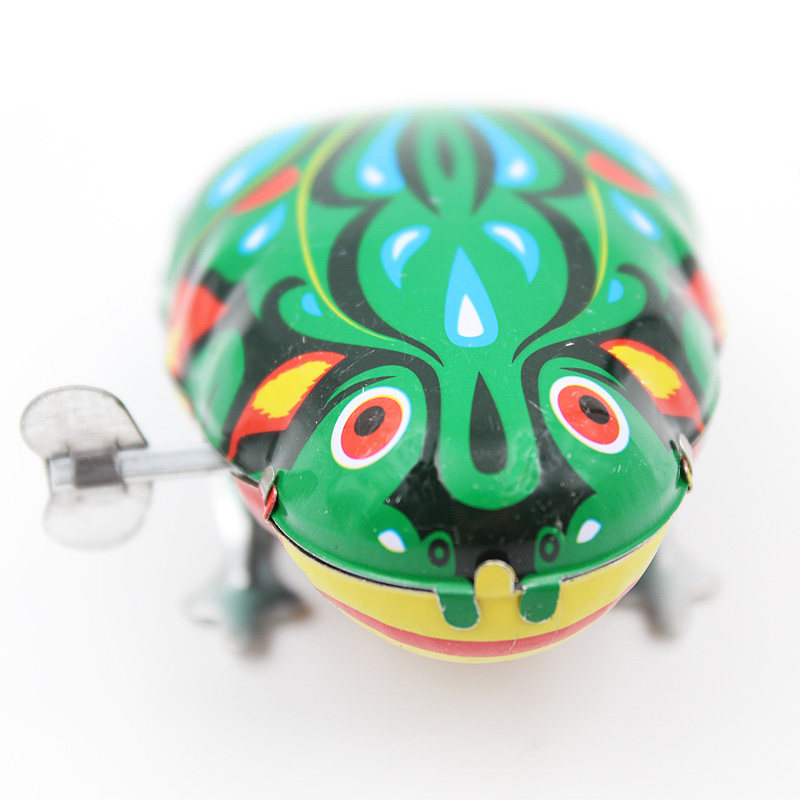 Nostalgic toy on the chain clockwork tin frog after the 80s retro memories of childhood classic children's toys bouncing frog