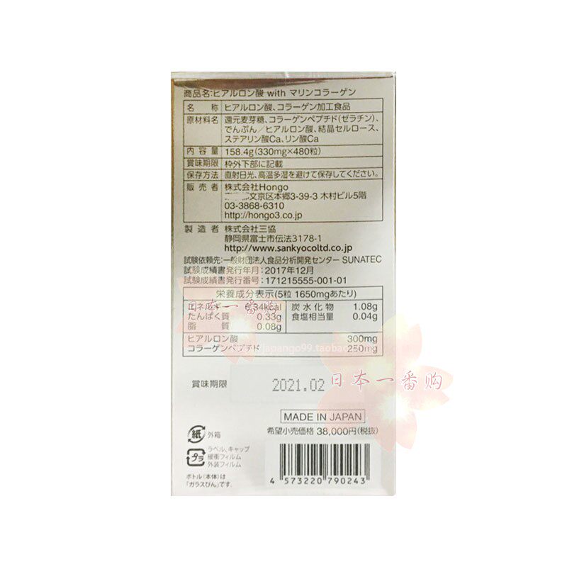 Japan HONGO Hyaluronic Acid Hyaluronic Acid Collagen 480 capsules tax included