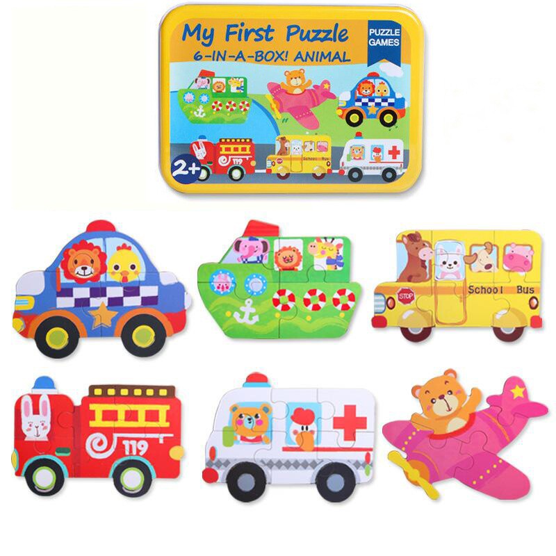 Large children's wooden puzzle iron box exquisite animal insect traffic building blocks six-in-one 1-2-3 years old