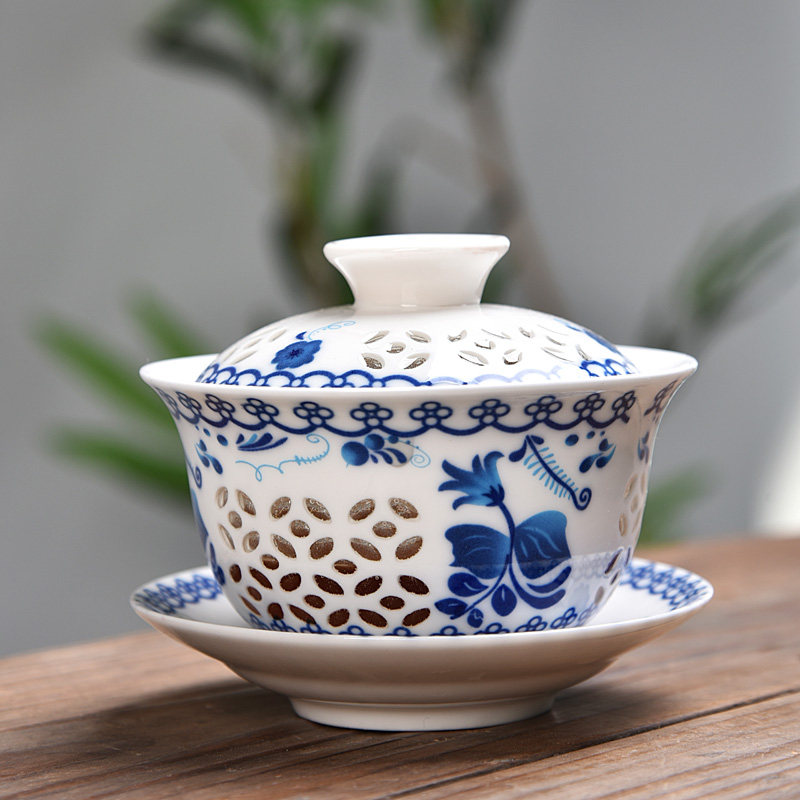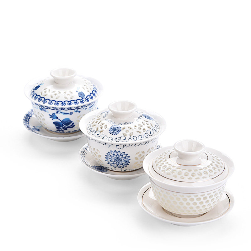 Cover Bowl Teacup Tea Bowl Large and Exquisite Hollowed-out Green Flower Porcelain Bubble Tea Bowl CERAMIC WHITE PORCELAIN THREE-ONLY BOWL HAND GRIP POT
