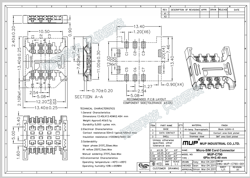 MUP-C790 MICRO SIM Card Holder 6P Original Drawer SMD High Quality