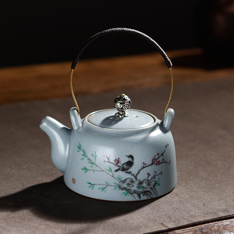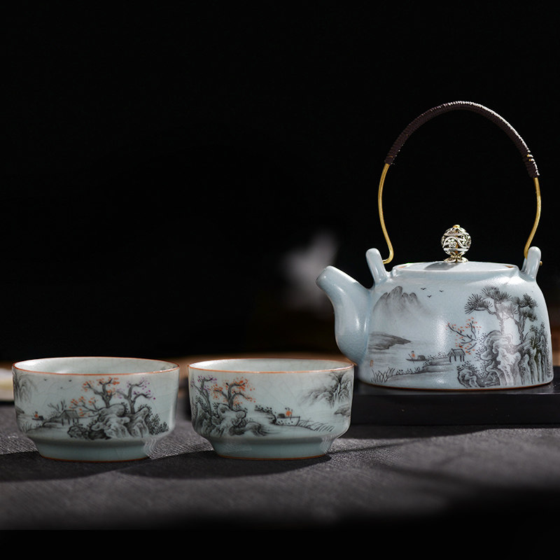 Jingdezhen Ceramic Ru Kiln Sky Green Open Sheet Teapot Home Bubble Teapot Hand Painted Ink Color Tietian Hand Tea Set