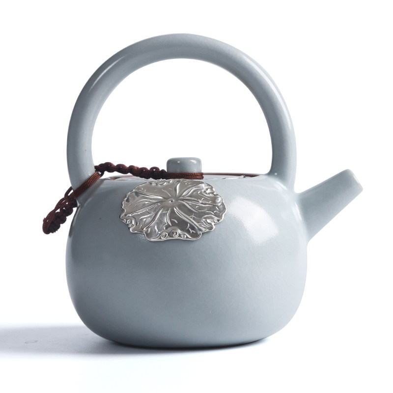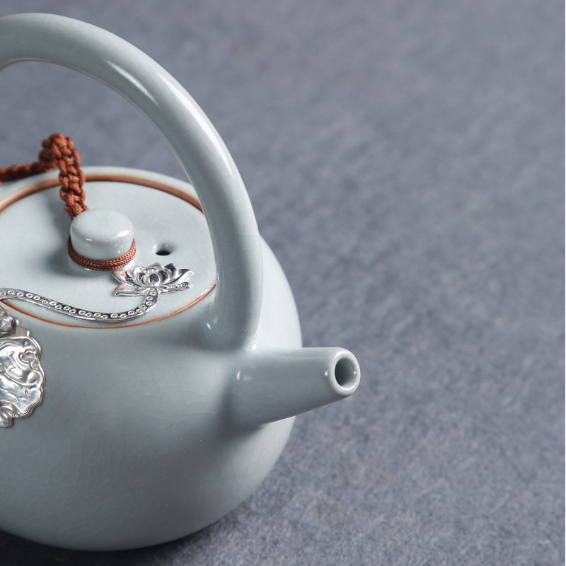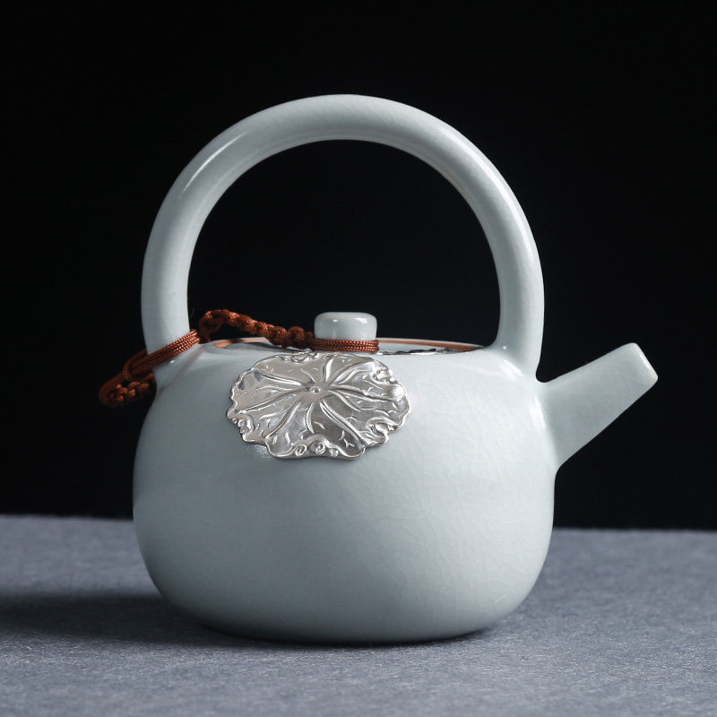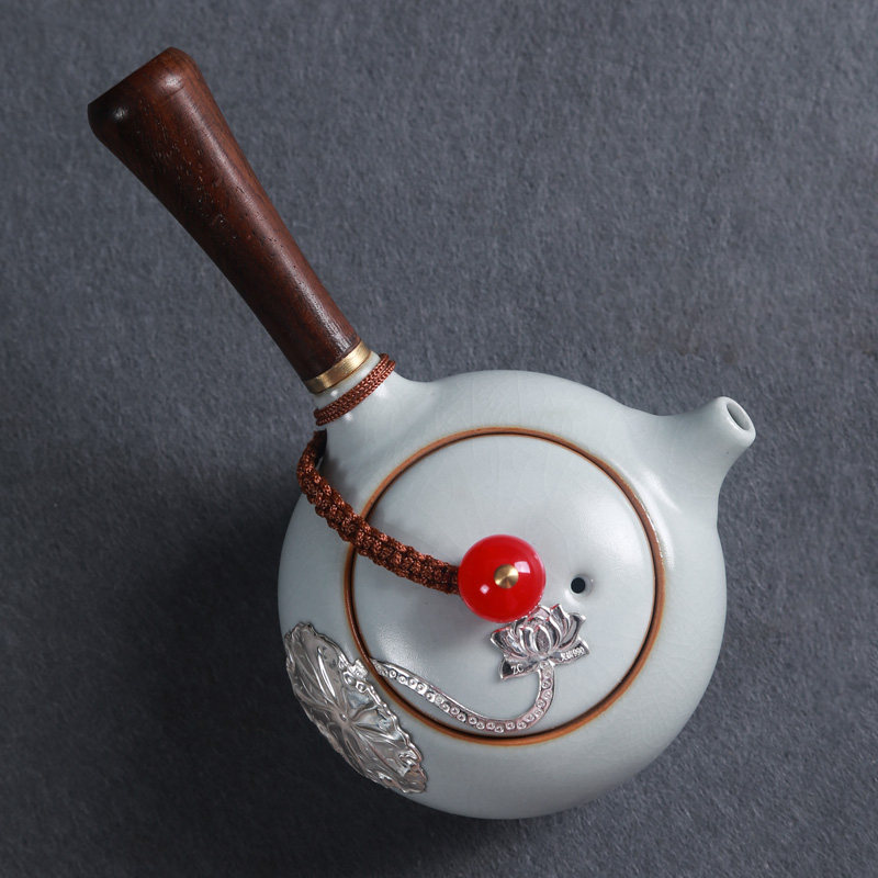 Ru kiln inlaid silver ceramic teapot open sheet Raised Beam Pot side to make pot Kung fu tea furniture with large number of tea making pot