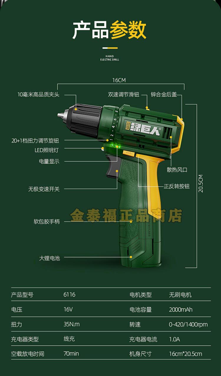 Green Giant 16V Lithium Electric Drill Double Speed Electric Drill Charging Pistol Turn Brushless Punching Electric Screw Driver Driver Electric Driver