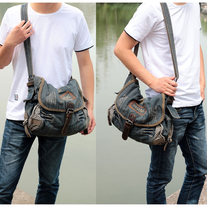 Denim shoulder bag men's and women's casual cross-body bag Korea simple antique literature wash canvas bag student school bag tide
