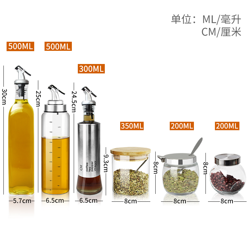 6 500ml oil bottles 4 bamboo and wood caps (with spoons) 10 sealed bottle shelf funnels 6 500ml oil bottles 4 steel spoon cans 4 bamboo and wood caps (with spoons