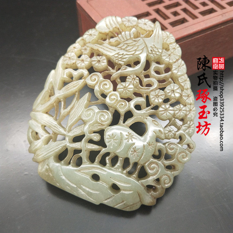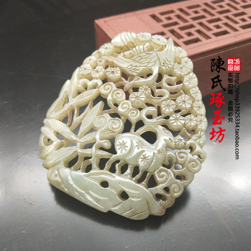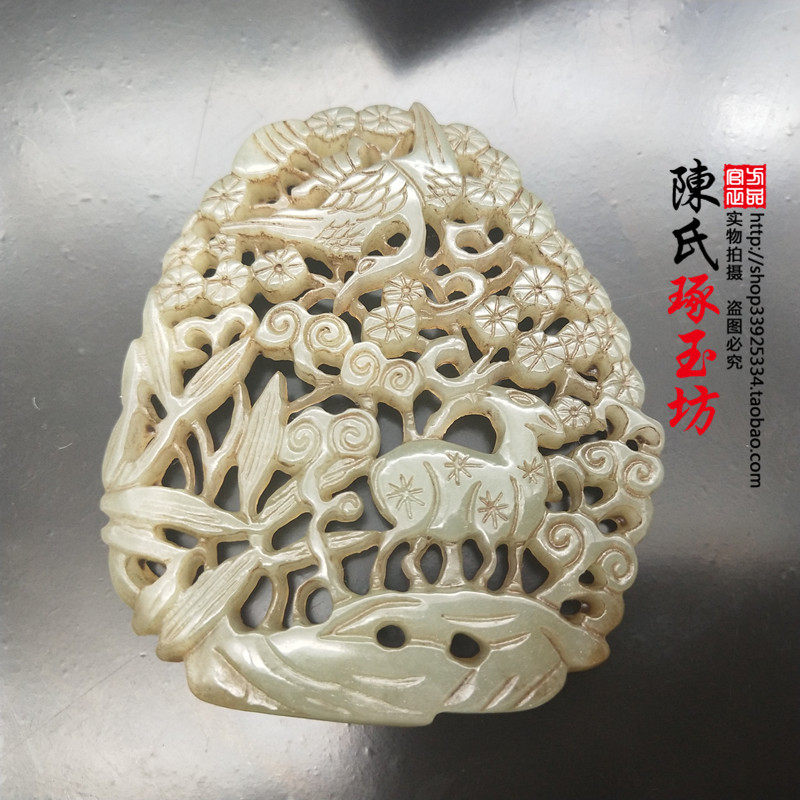 Antique jade Liaojin silk work Songhe Yanyan jade pendant Fu Lu jade Hetian jade blue and white jade hollow jade