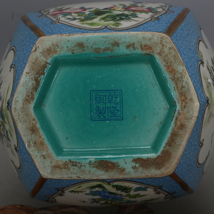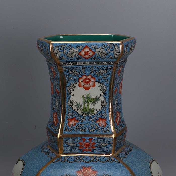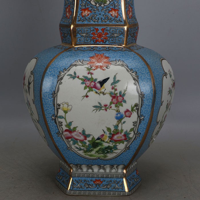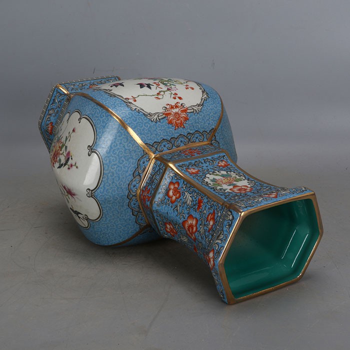 Qing Qianlong imperial pastel flower and bird pattern hexagonal flat bottle made of old official kiln antique porcelain antique collection ornaments