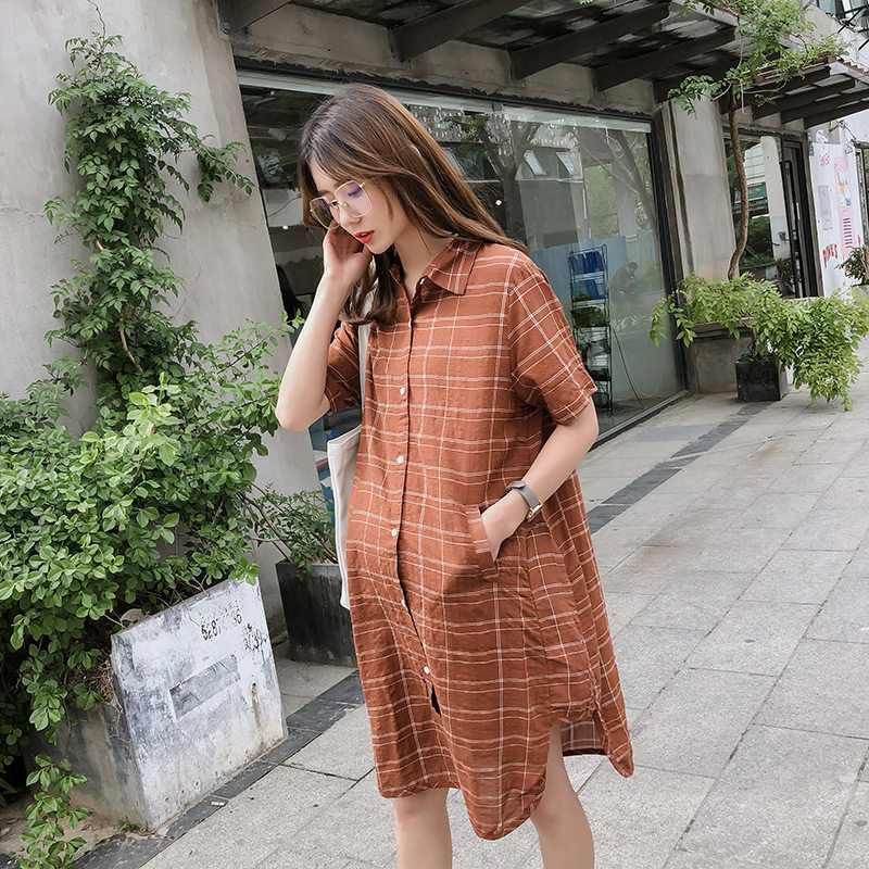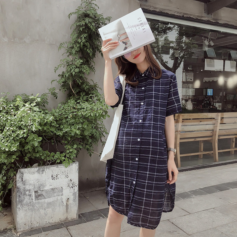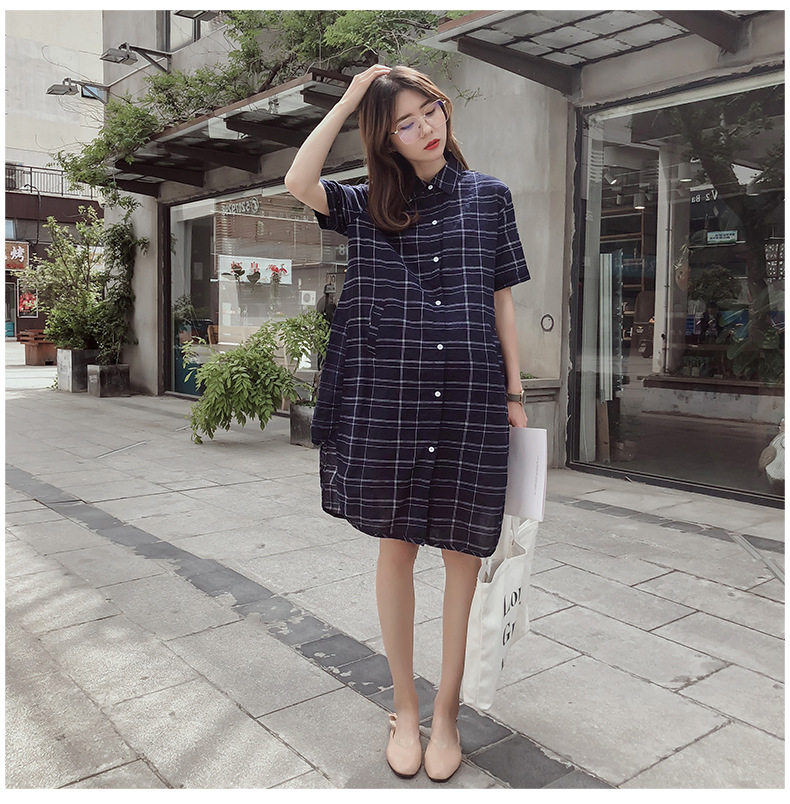 Summer Gestational Woman Dress 2019 Fashion Short Sleeve Plaid Pregnant Woman Shirt Dress Literary Loose large size for long version of the dress
