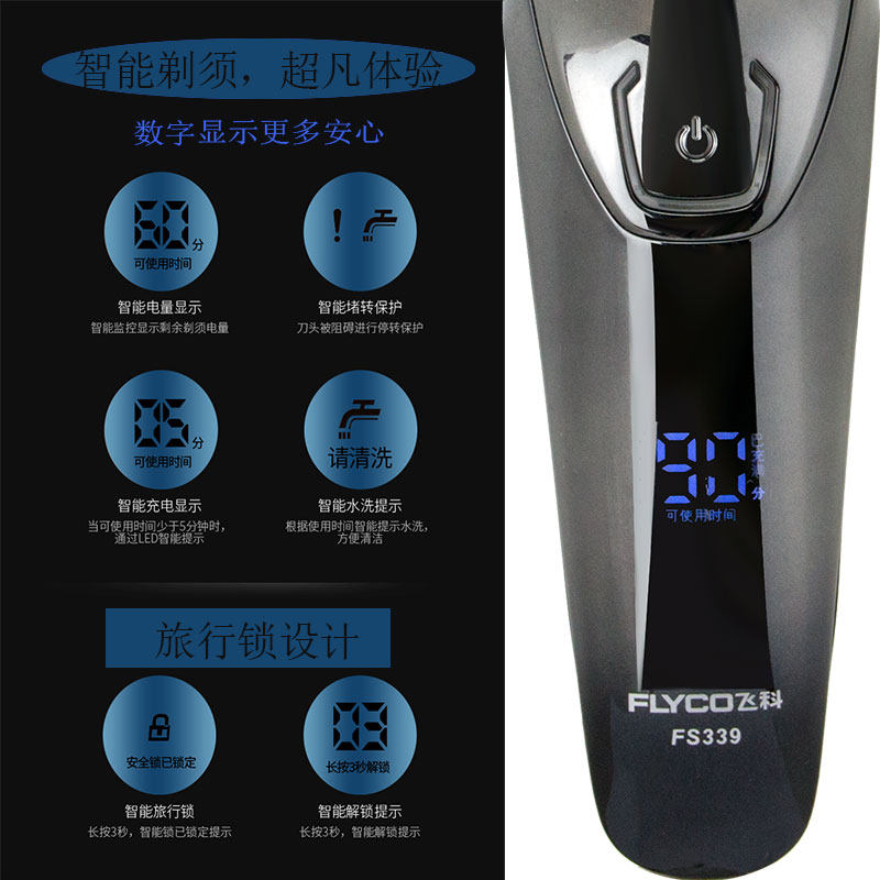 Feike Electric Shaver FS 339 Wash for an hour fast charging shows three heads with a swipe knife