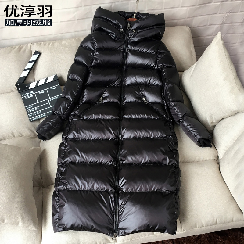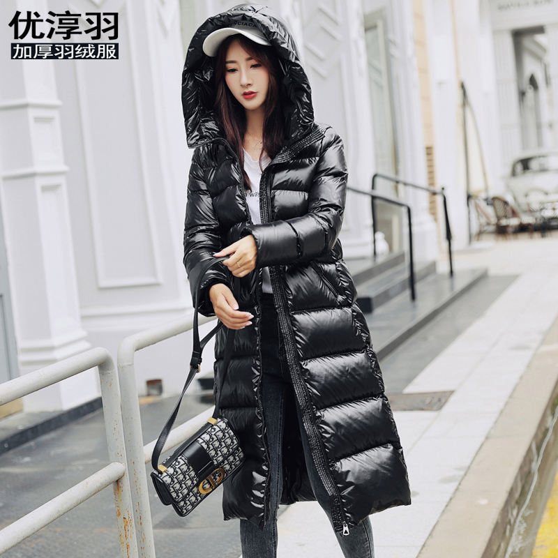 UYouchun plume thickened down jacket Women's medium long version with hat bright face Han version Tide Over Knee Winter Northeast Super Thick White Duck Suede