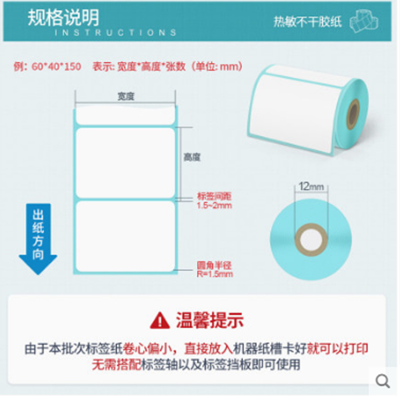 Portable printer with 60*40*30 small roll core thermal adhesive label paper express paper post storage paste