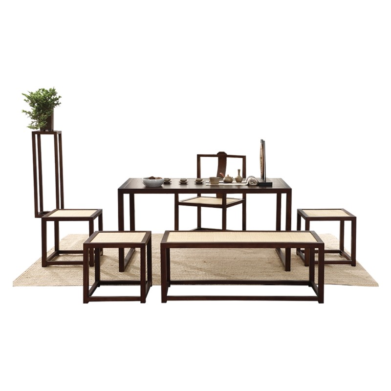 Tea table (length 1800* width 850* height 750) main chair (length 650* width 550* height 930) bench ((length 1200* width 450* height 450)) low stool