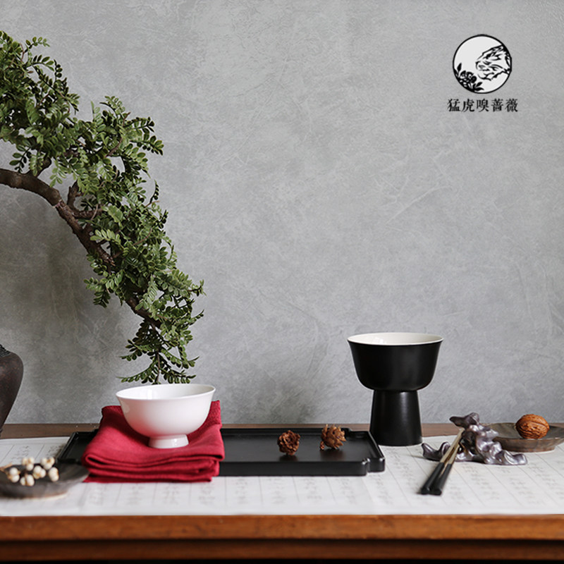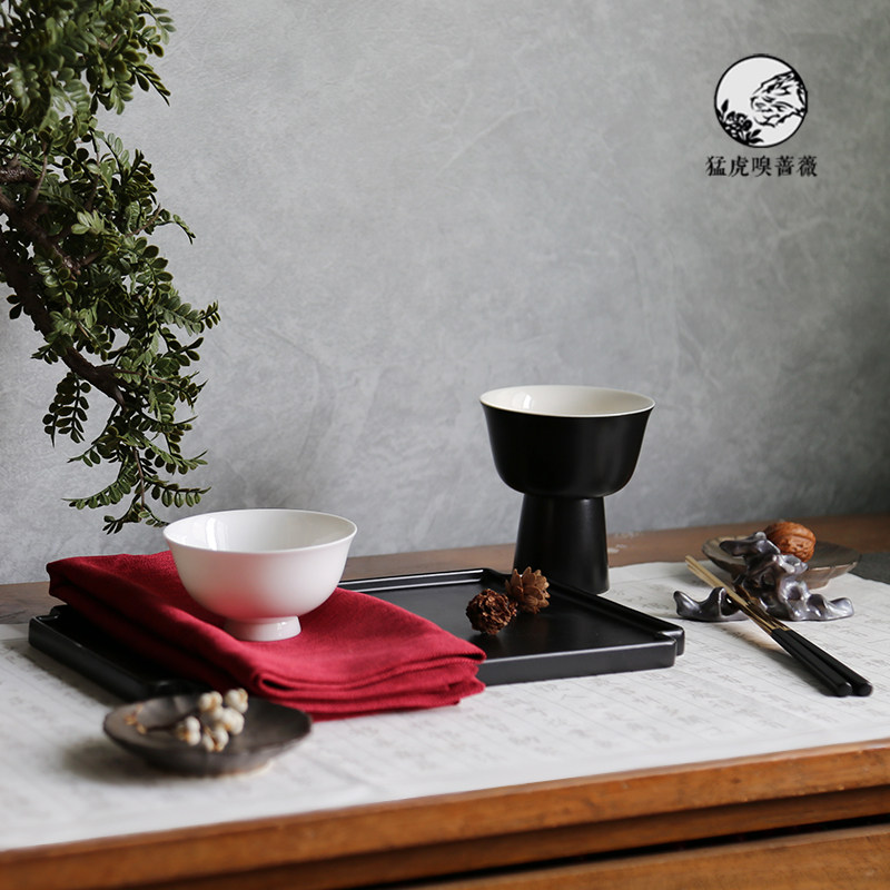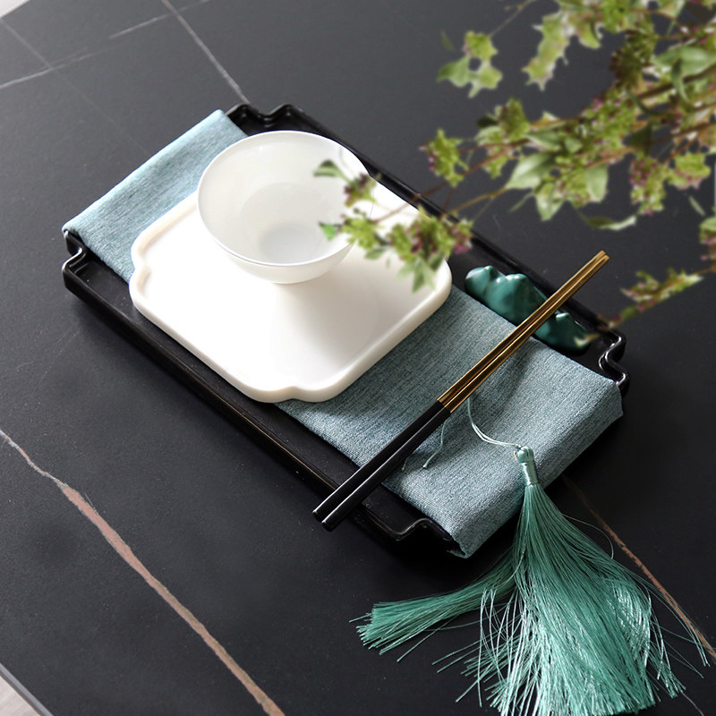 Black and white goblet tall jade porcelain bowl black pane tray crimson napkin alloy chopsticks Taihu stone chopsticks rack glazed ceramic plate 7-piece set green 7-piece set