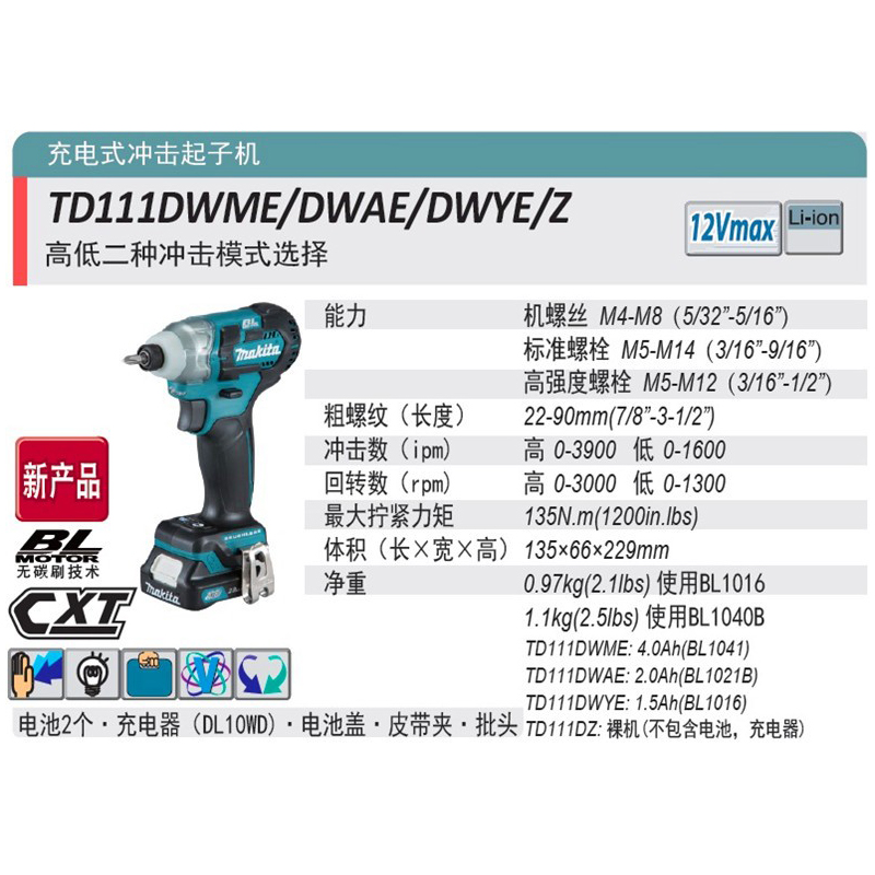 TD111DZ (bare metal without battery charger) TD111D single power 1 5AHTD111D single power 2 0AHTD111D single power 4 0AHTD1