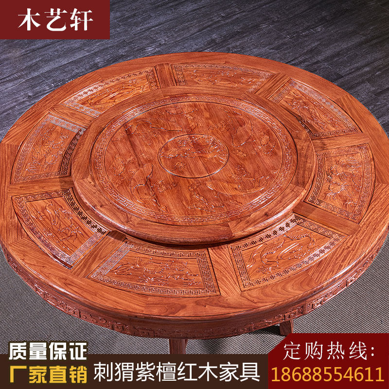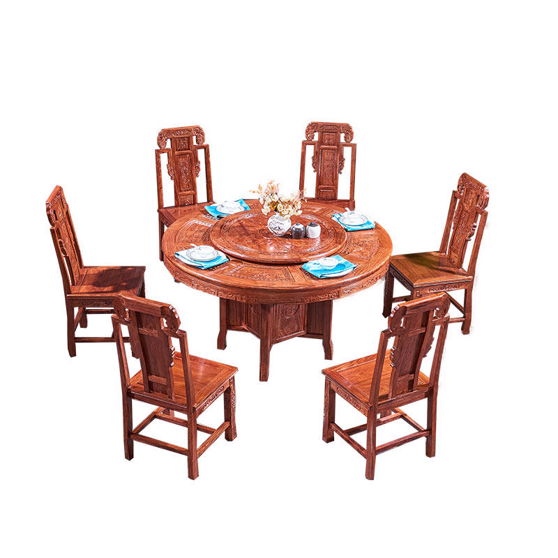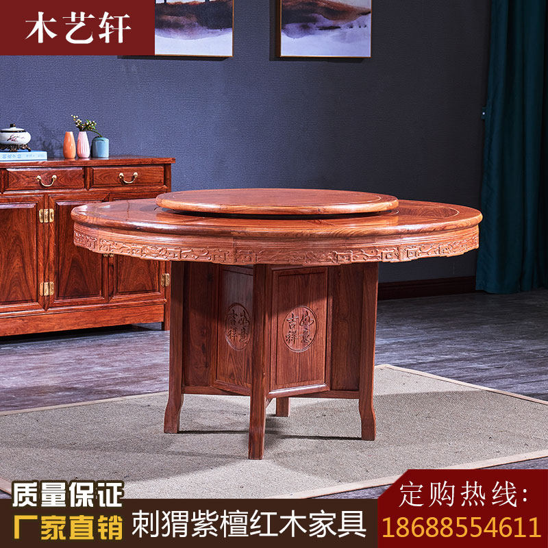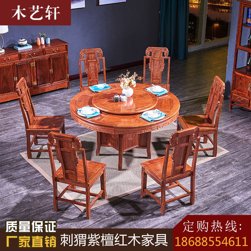 Mahogany electric dining table and chair hedgehog red sandalwood dining table new solid wood round dining table Chinese style rosewood restaurant combination