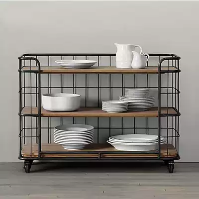 American vintage iron solid wood hand push mobile dining car kitchen storage seasoning jar rack microwave oven oven rack bowl cabinet