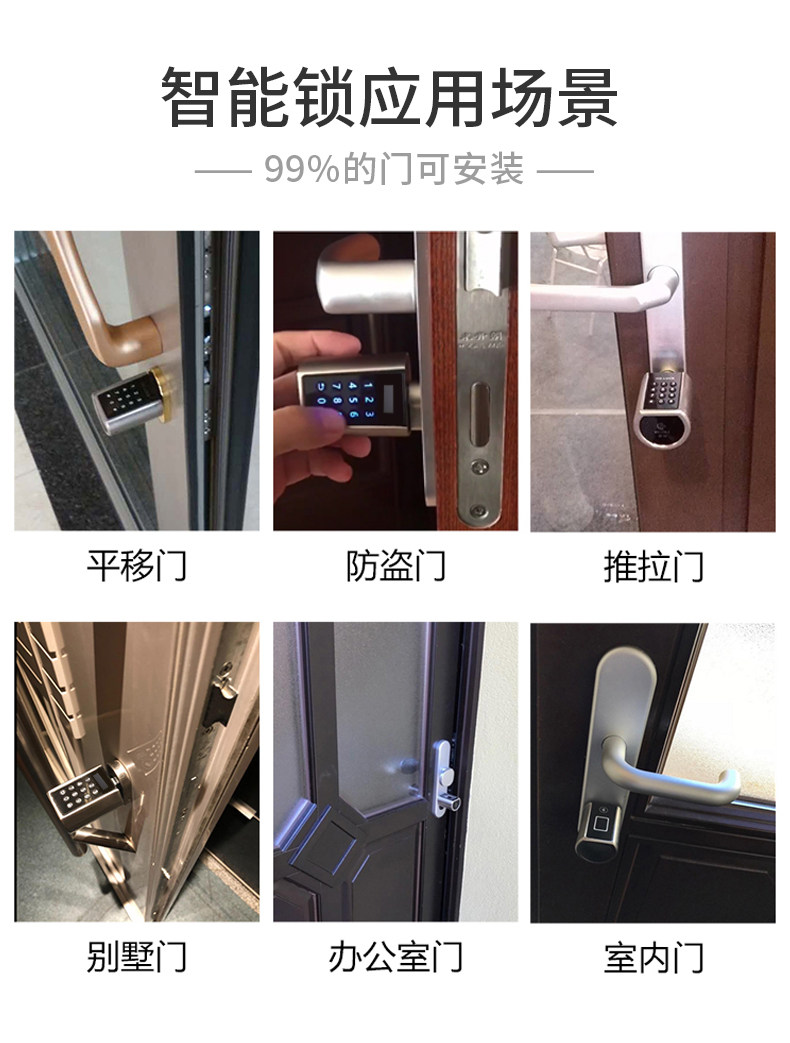 Password Bluetooth (small lock cylinder indoor door dedicated) Password + Bluetooth APP + Backup unlock (large lock cylinder) Password + Bluetooth APP + Swipe NFC + Backup Unlock (Large Lock Cylinder) Password + Bluetooth APP + Swipe NFC + Key (48 *65*) Fingerprint + Bluetooth APP + Swipe NFC + Backup Unlock (Large Lock Cylinder) Import fingerprint + Bluetooth APP + Remote control + Backup Unlock (Large Lock Cylinder)